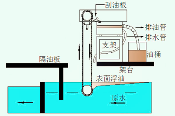 油分離回收過程:一體化油水分離回收裝置是利用油水之間不同的重力和表面張力這些物理特性,使刮油帶在穿過水面時吸取浮油、重油等有機液體。當攜油帶繞過重輪向上離開液面時,液面上的油吸附在濾帶的表面進入二次分離池,經二次分離后進入收集器。一體化油水分離回收裝置采用進口的立毛纖維濾帶。立毛纖維濾帶是在粗目的NYLON織布上涂敷特殊粘合劑后,利用靜電植毛技術于其上種植長度不等且具方向性的NYLON纖維而成。